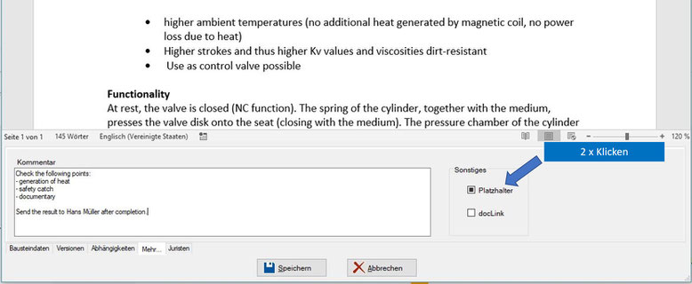 Die Metadaten werden immer automatisch aktualisiert, sobald Änderungen an dem entsprechenden Textbaustein vorgenommen werden. Voraussetzung dafür ist Aktivierung der Platzhalter-Checkbox (2x klicken = schwarzes Kästchen).